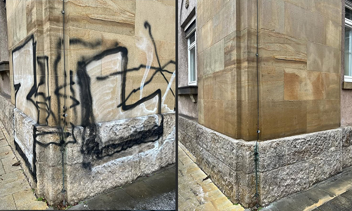 Auch Graffitis lassen sich mit dem richtigen Verfahren vollständig entfernen. Farben, Bindemittel und Pigmente werden gezielt aus der Oberfläche gelöst, sodass keine Schatten oder Rückstände zurückbleiben. Die ursprüngliche Optik der Fassade wird wiederhergestellt, ohne das Material zu beschädigen.