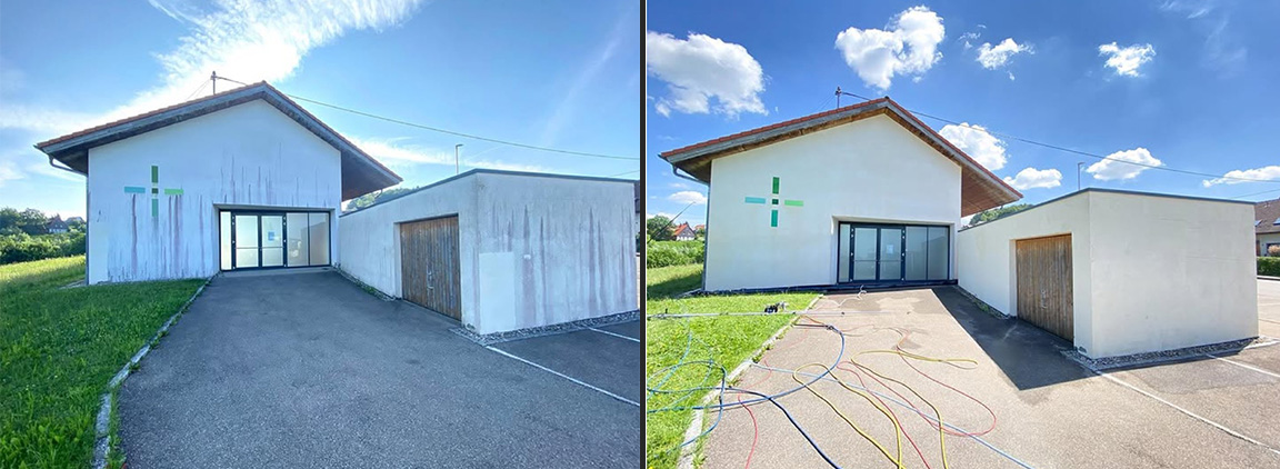Fassadenreinigung Vorher-Nachher: Sehen Sie, wie stark eine Fassadenreinigung das Erscheinungsbild Ihrer Immobilie verändern kann.